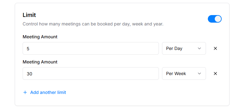 Control how many bookings a client can make per day, week, or custom period. This prevents overbooking and helps manage schedule efficiently.