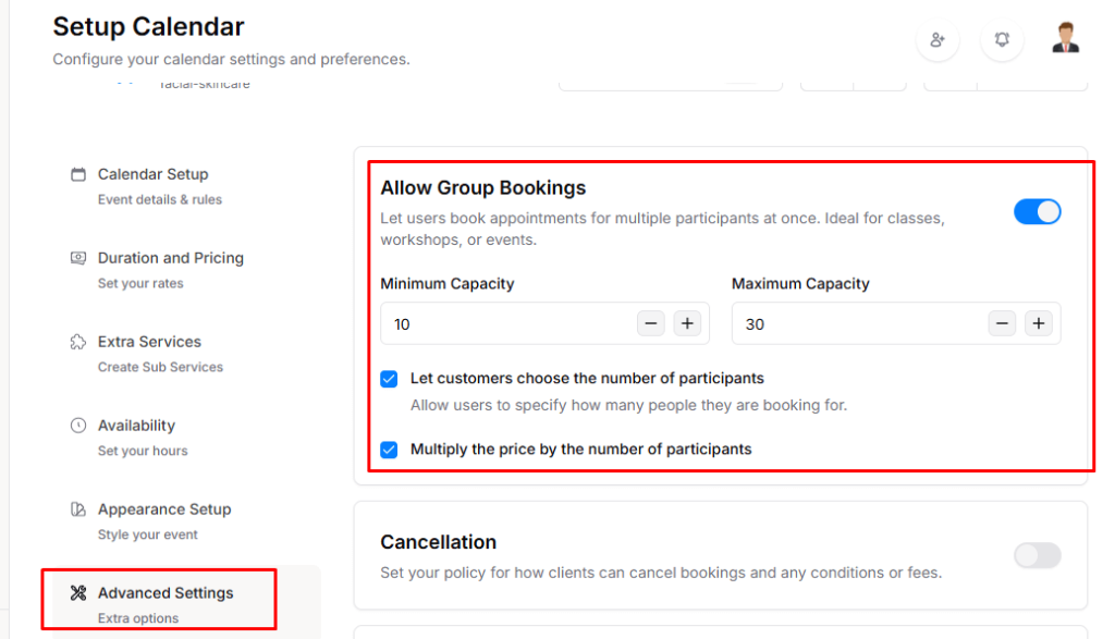 - At the top of the settings page, you will see the Allow Group Bookings option. Enable the toggle to allow group bookings.