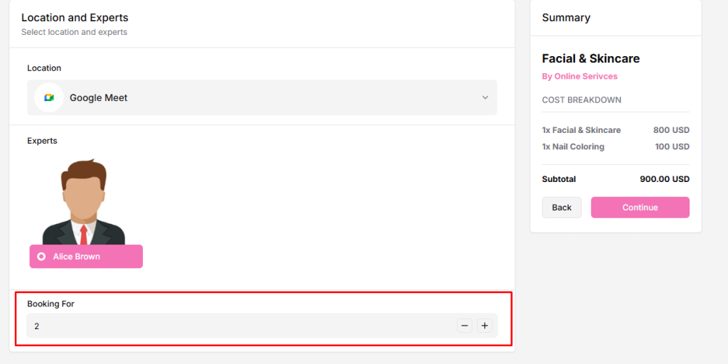 Once Group Booking is enabled, the front-end booking page will automatically display the group booking options for that service. Customers will then be able to select the number of participants and see the updated pricing accordingly.