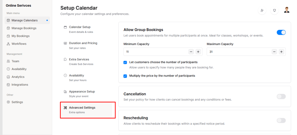 In the Advanced Settings section, you can manage additional booking controls and preferences. You can set Group Booking, Cancellation, and Rescheduling Rules, customize Booking Questions for invitees, and enable Calendar Conflict Checks to prevent double bookings.