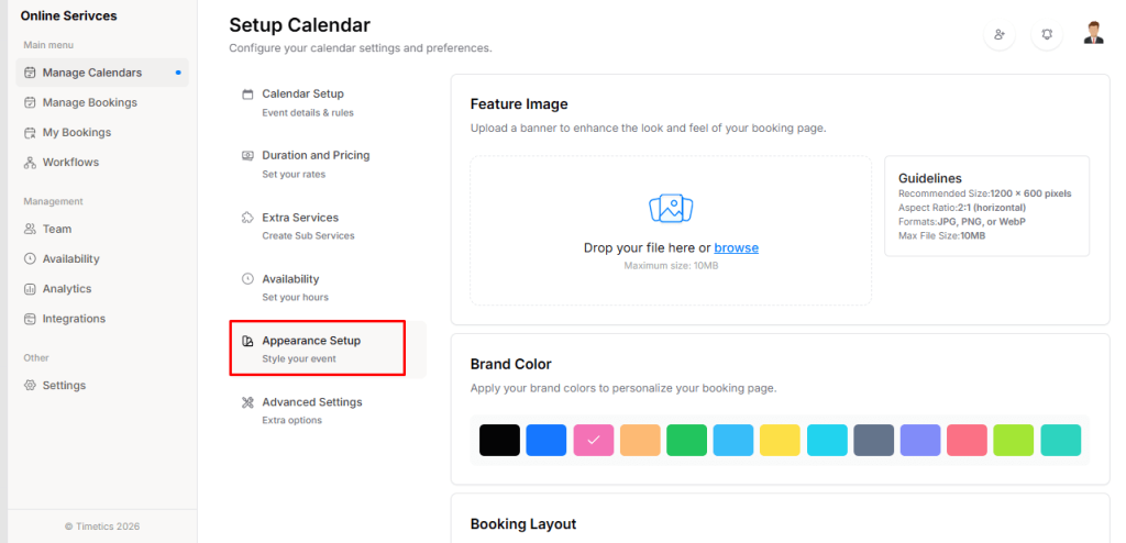 In the Appearance Setup section, you can customize the visual style of your booking page. You can upload your Feature Image, apply Brand Colors, and choose the preferred Booking Layout, such as Month, Week, or Day view.