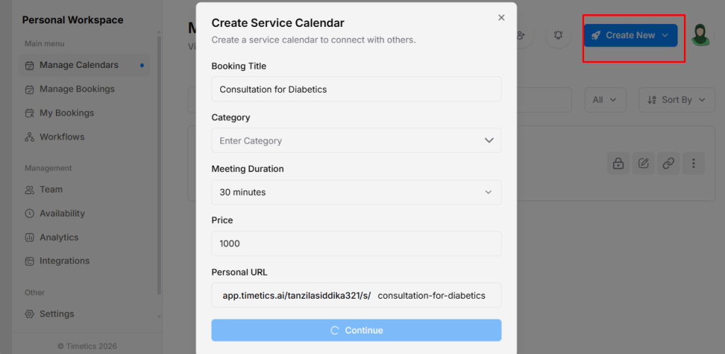 - Fill in the service details in the pop-up: Booking Title, Category, Meeting Duration, Price, and Personal URL.