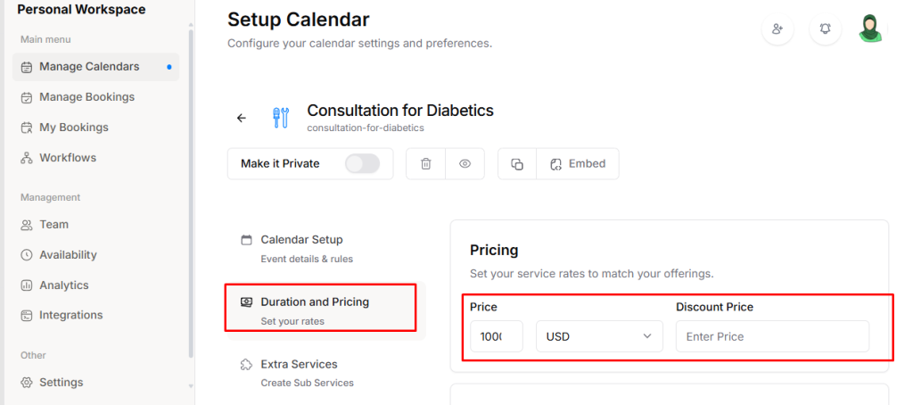 At the top of the Calendar Setup, you can manage Booking Status, make it Private, Delete, Preview, Duplicate, or Embed it, quickly controlling visibility without altering core settings.