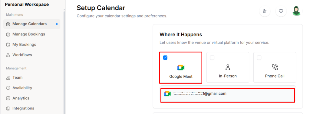 Then go to Manage Calendars → Setup Calendar, and in the Where It Happens section, select Google Meet.