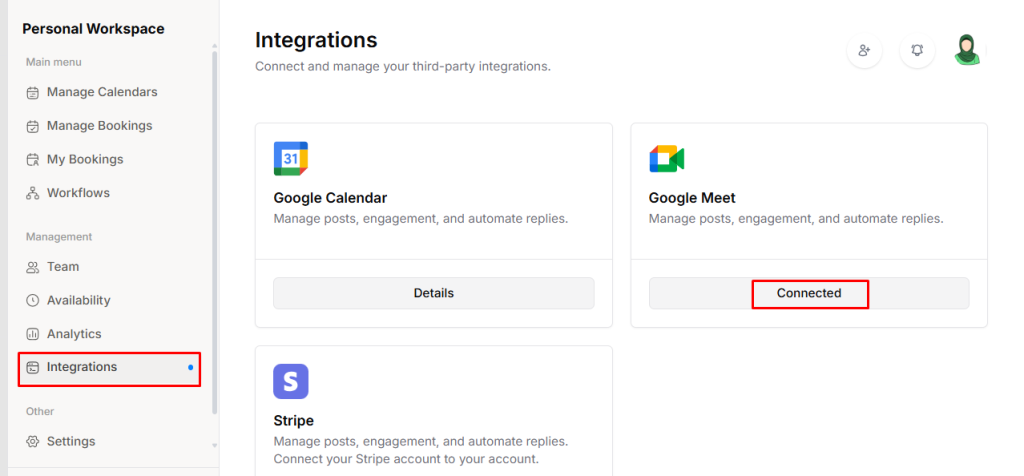 First, you need to connect your Google Calendar, once the calendar is connected, Google Meet will be automatically linked. Follow the previous documentation to complete the Calendar connection process.